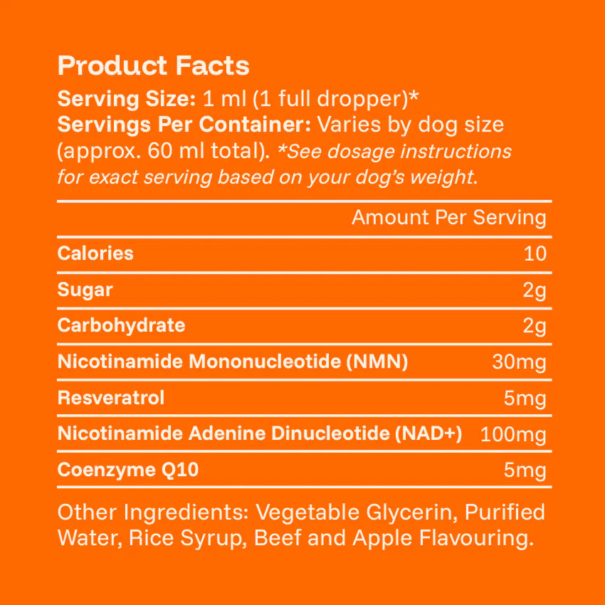 It supports your dog’s energy, mobility, and overall vitality by boosting NAD+ levels and promoting healthy cellular function. The formula helps combat age-related fatigue, stiffness, and cognitive decline — so your dog stays active and happy longer.