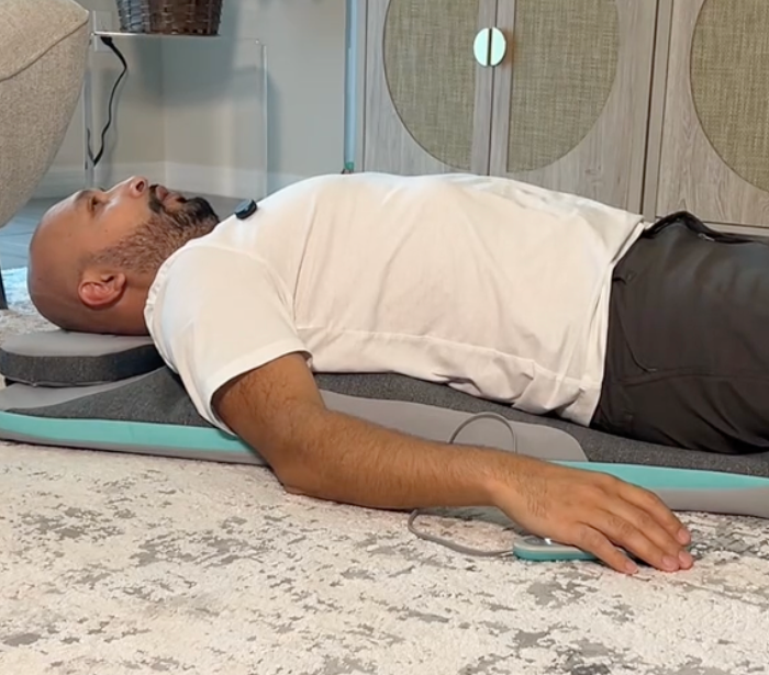 - Place the mat on a flat surface and lie down comfortably
