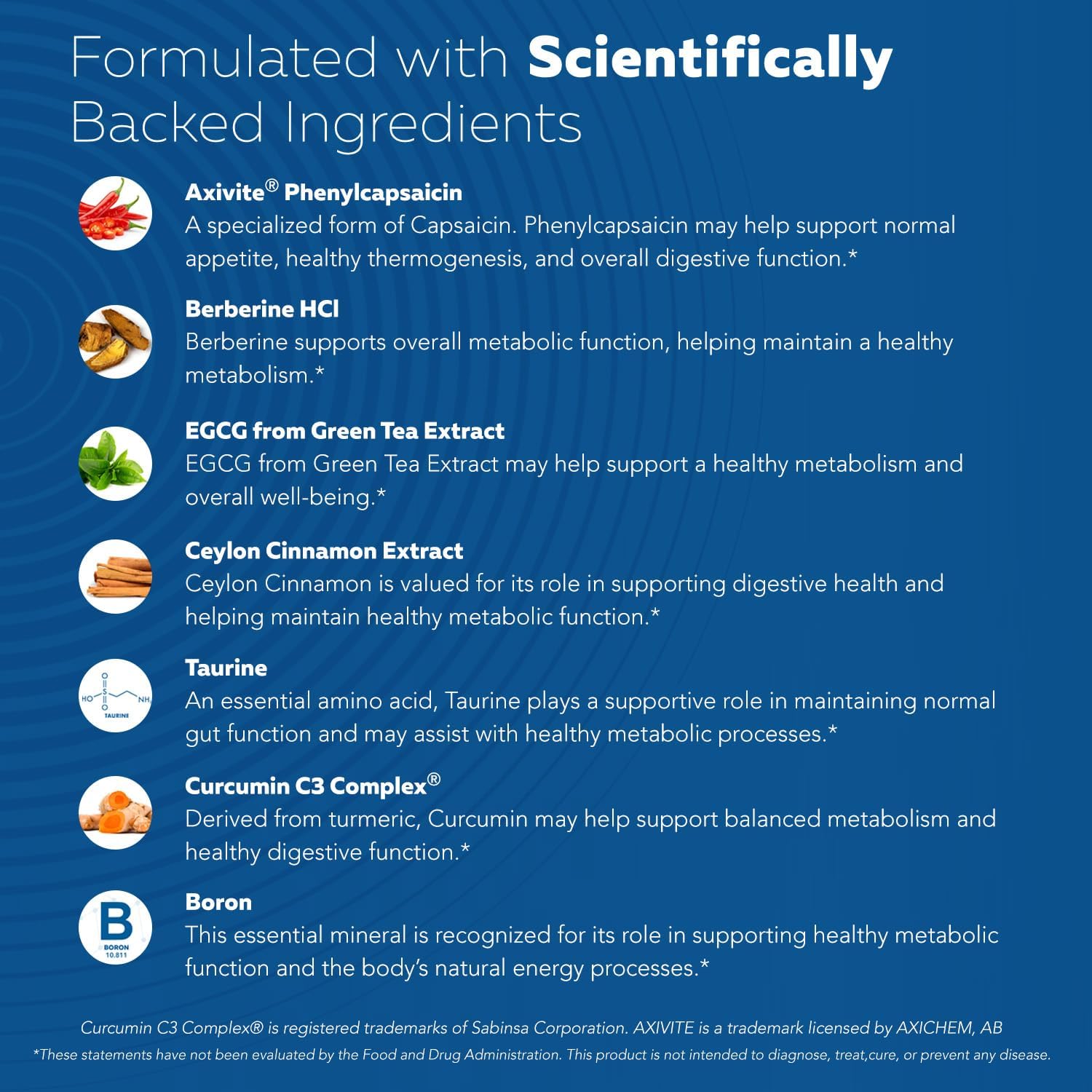 This formula includes clinically studied ingredients such as Berberine Extract, Green Tea Extract, Ceylon Cinnamon, Phenylcapsaicin, Curcumin, and Boron— all known for supporting metabolic balance, blood sugar health, and appetite control naturally.