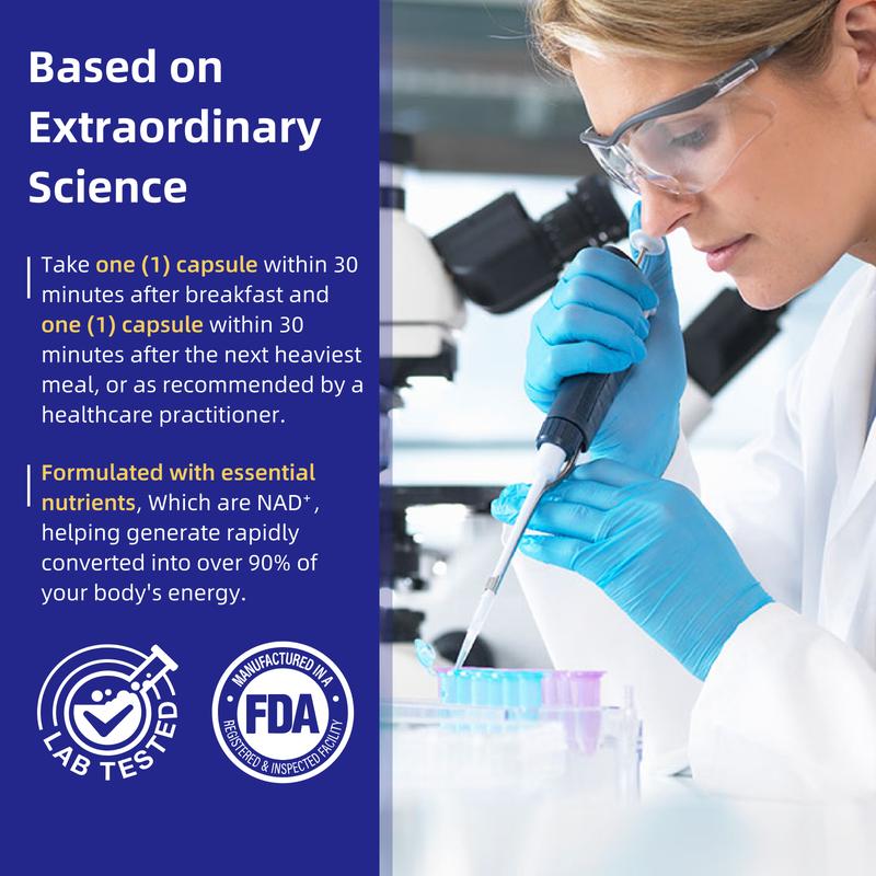 📈 Boosts NAD+ Levels Naturally: As we age, NAD+ production declines — impacting energy, cognition, and recovery. This advanced formula helps restore optimal NAD+ levels to promote cellular renewal and healthy aging.