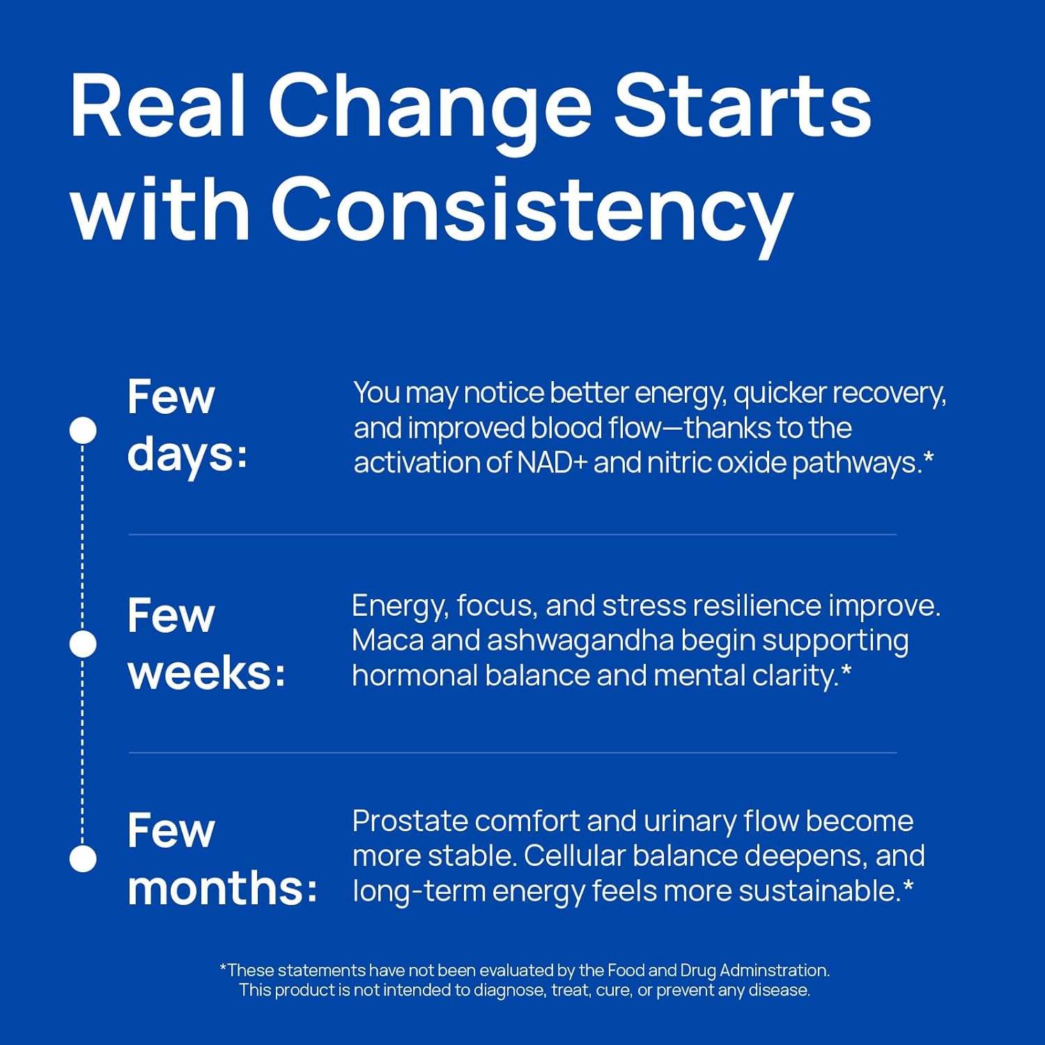 Most men feel increased energy, focus, and stamina within 7–14 days. Prostate and circulation benefits may continue to improve over 4–6 weeks with consistent daily use.